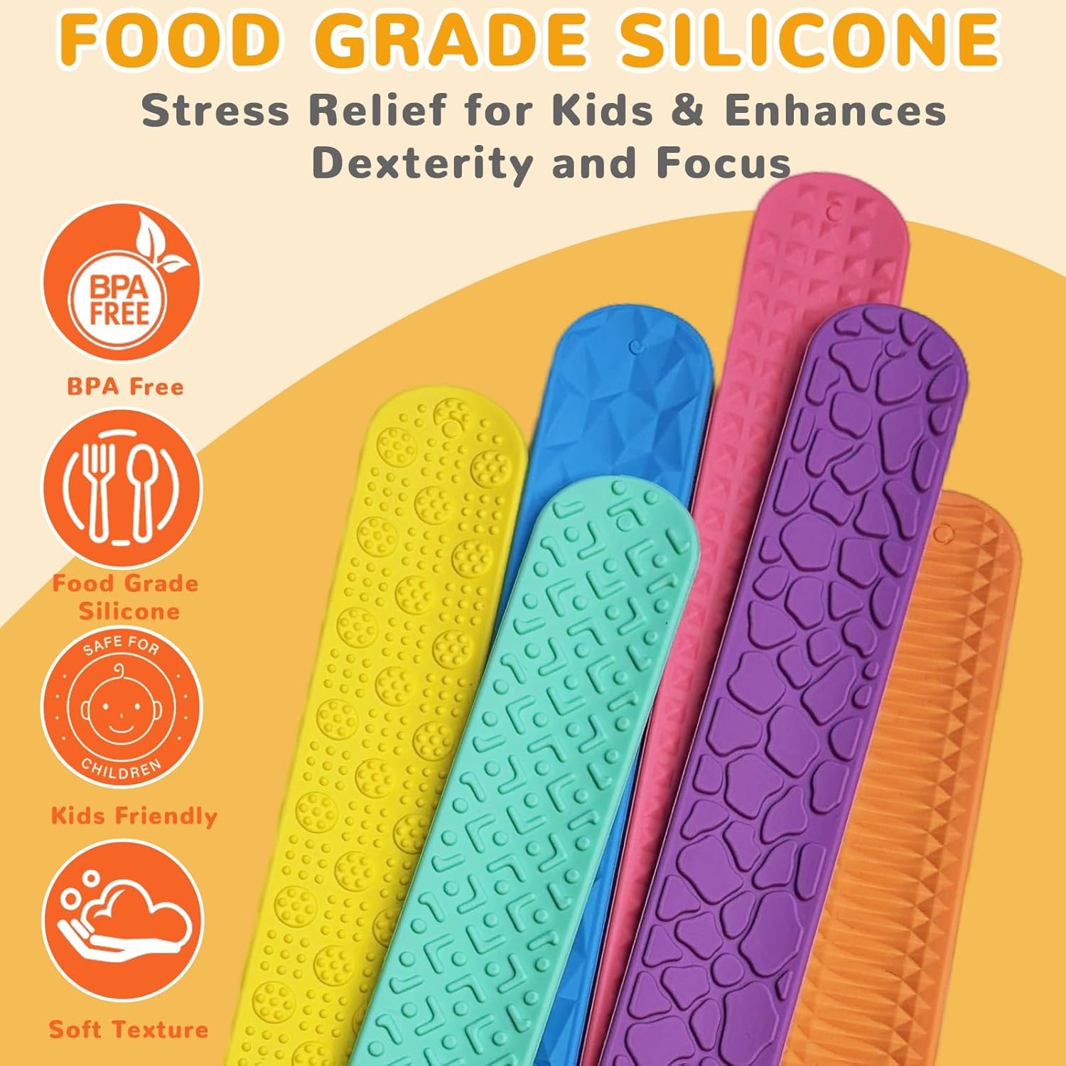 • Set Includes: 6 assorted textured silicone slap bracelets