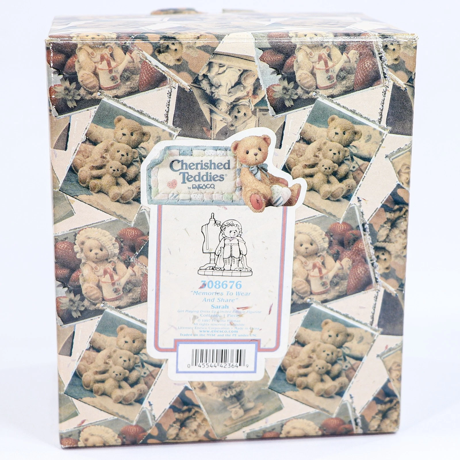 Introducing the Cherished Teddies Sarah 308676 Vintage Collectable Figurine, a delightful addition to any collection of cherished memories. Designed by the talented Priscilla Hillman and manufactured in 1997, this charming figurine is a true representation of the magic and warmth that teddy bears bring into our lives.
