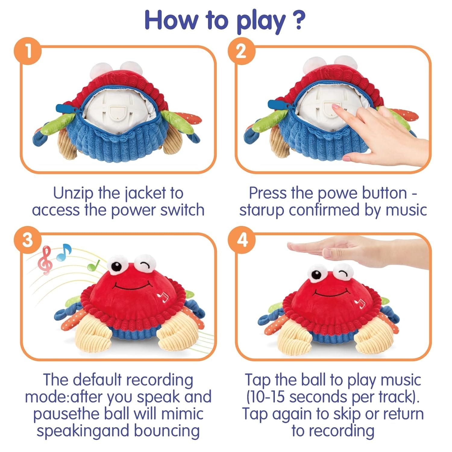 • Interactive Fun: The crawling crab plays cheerful music and features engaging sounds to stimulate your baby’s auditory senses.
