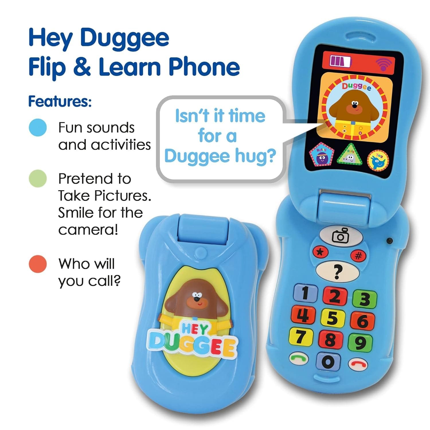 Product Overview:Introducing the Hey Duggee Flip & Learn Toy Phone, the perfect companion for your little ones aged 18 months to 10 years! This vibrant blue toy phone is designed to engage, educate, and entertain while supporting essential child development skills.