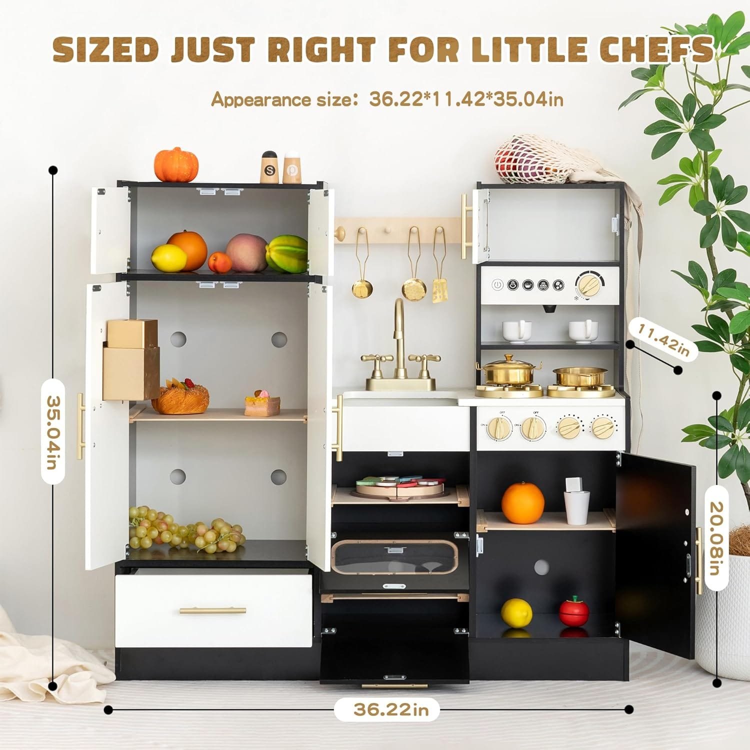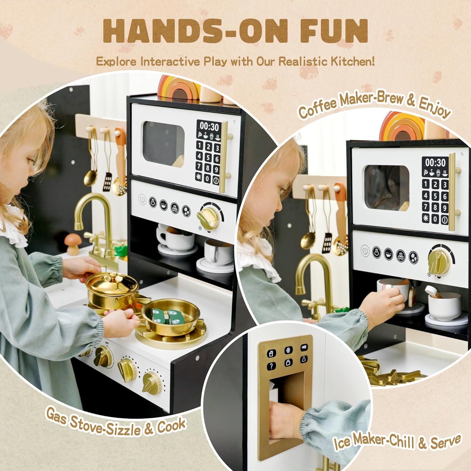 • Interactive Play: This play kitchen set includes 12 kitchen toy accessories, allowing kids to whip up their favorite meals and serve imaginary guests. From pots and pans to utensils, your little chef will have everything they need to create delicious pretend dishes.