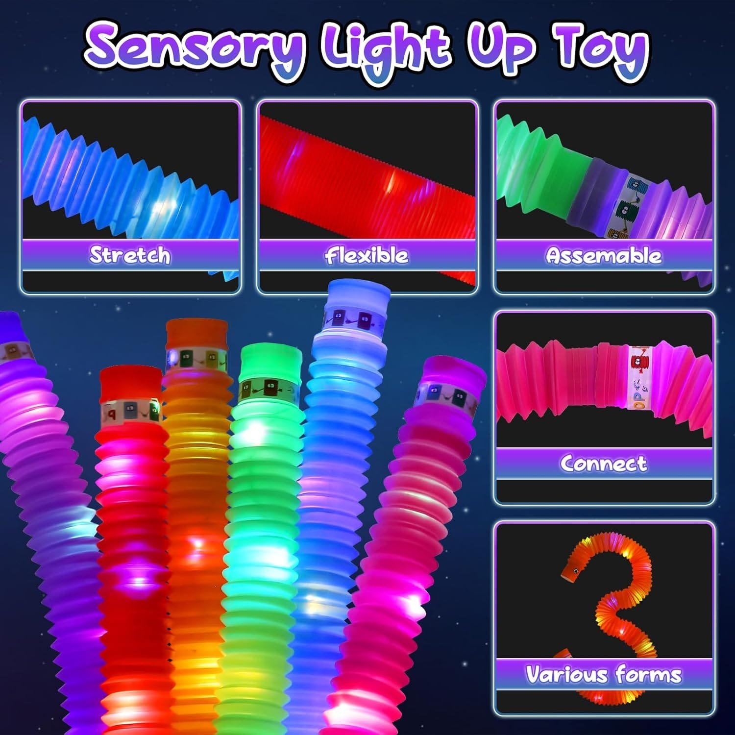 Elevate your sensory play with the Joyreal Sensory Toys for Autism! This vibrant collection of LED light-up toys is designed to provide sensory stimulation and support the development of visual, auditory, and tactile cognition. Perfect for children with autism or anyone seeking a fun way to relieve stress, this set includes 10 exciting fidget toys, sensory tubes, and captivating light-up maracas.