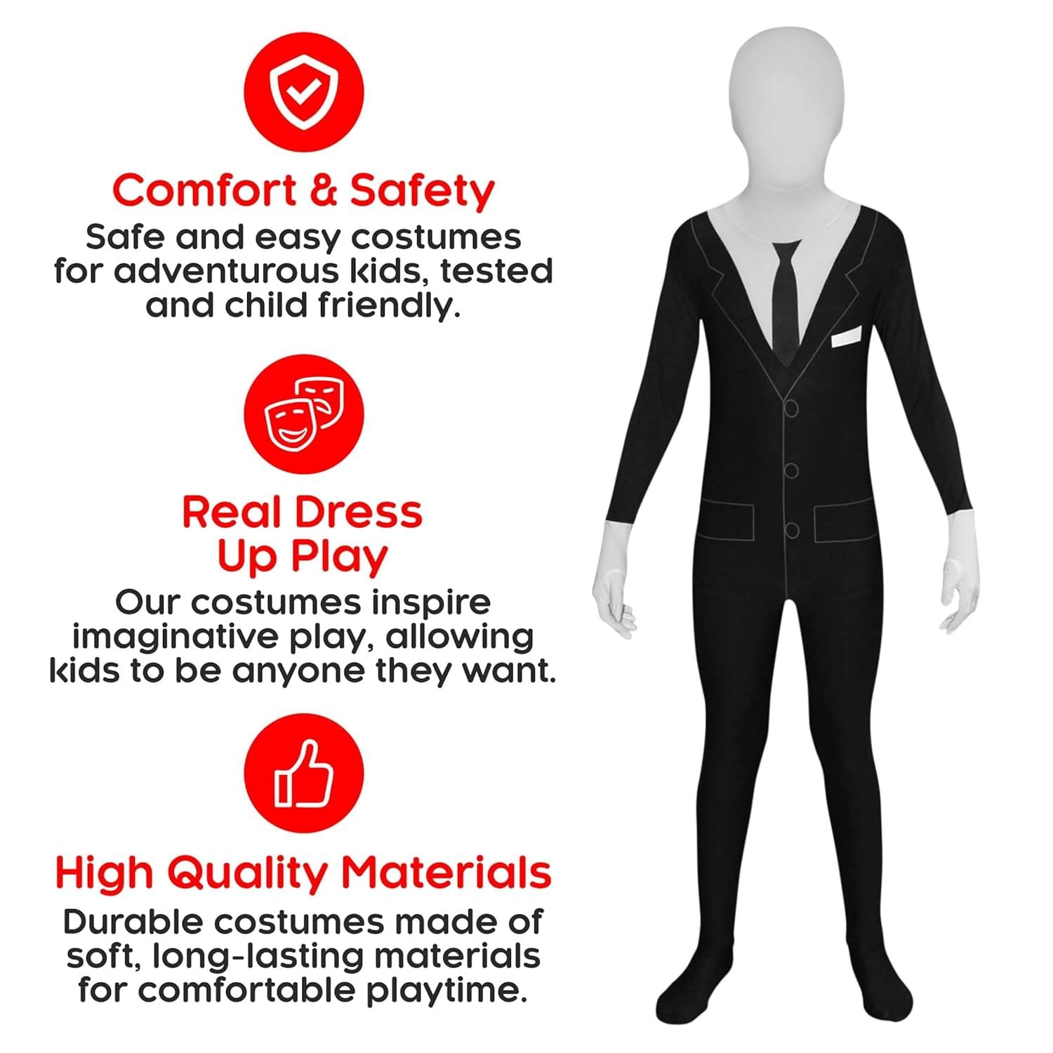 The suit was visually appealing with its simple colors and design. However, there were a couple of drawbacks: the large, bright white logo positioned just above the lower back stood out against the black fabric, detracting from the overall slender man look. Additionally, my child mentioned that they couldn’t see through the headpiece, so they had to keep it down most of the time for their safety.