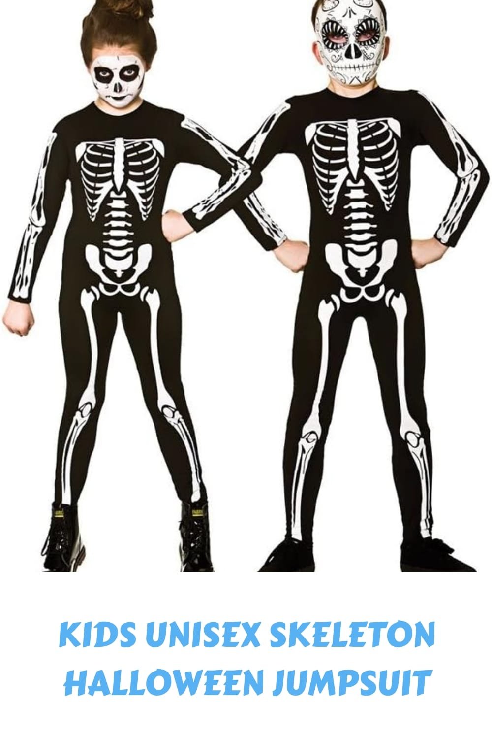 Transform your little ones into spooky skeletons with our Wicked Costumes Kids Unisex Skeleton Jumpsuit! Perfect for trick-or-treating or Halloween parties, this black jumpsuit with striking white bone imprints is sure to be a hit.