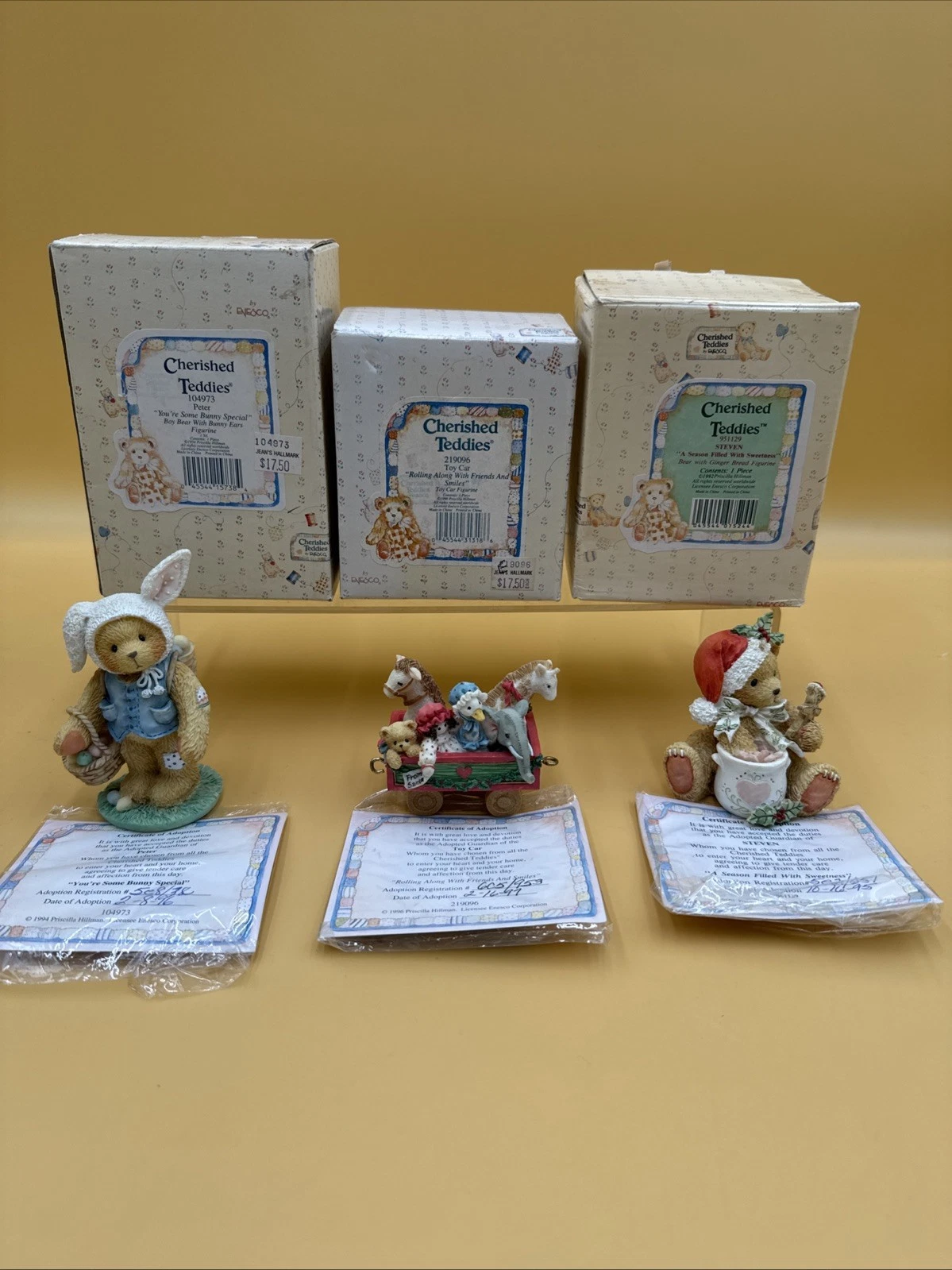 Lot/3 Vintage Enesco Cherished Teddies Figurines: Peter, Toy Car & Steven In Box