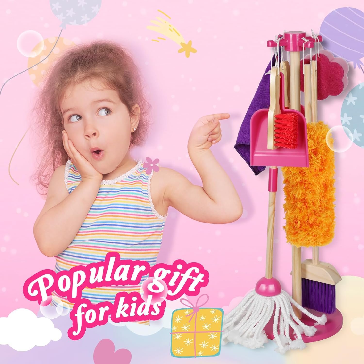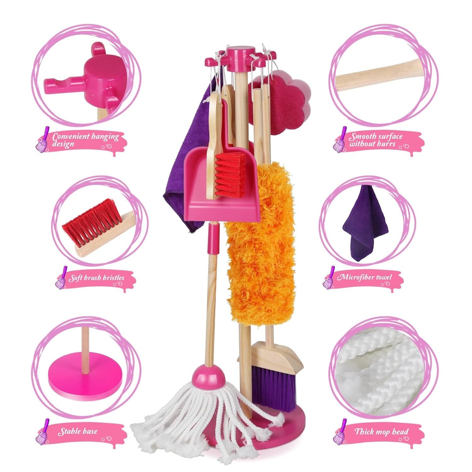 • Complete Cleaning Experience: This set includes 8 essential pieces that allow your child to engage in pretend play cleaning. The set features a broom, dustpan, mop, brush, duster, sponge, rag, and an organizing holder to keep everything tidy.