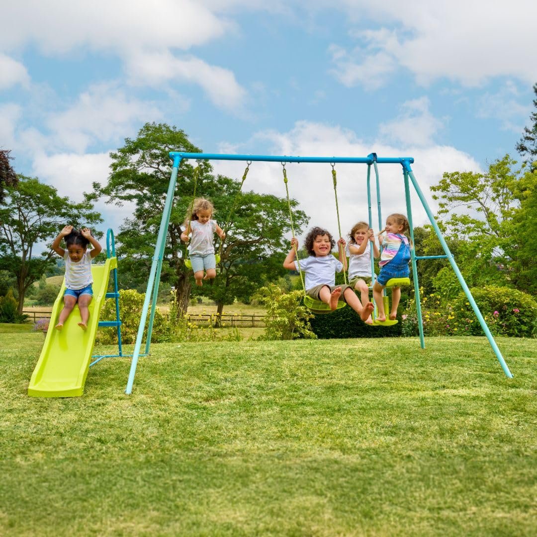 Transform your garden into a playground paradise with the TP Toys Metal Double Swing, Glide Ride & 6ft Slide Set! Perfect for families with active kids, this outdoor playset promises hours of fun, exercise, and adventure for children aged 3 and up.