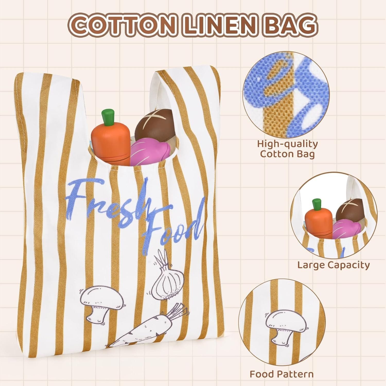 Lastly, the shopping bag included is well-made from heavier cotton canvas, stitched with seamed edges, and of a higher quality than typical reusable bags. It’s a practical addition for keeping all the parts together after play and might even be our kiddo’s favorite part, as they love bagging the groceries and checking out!